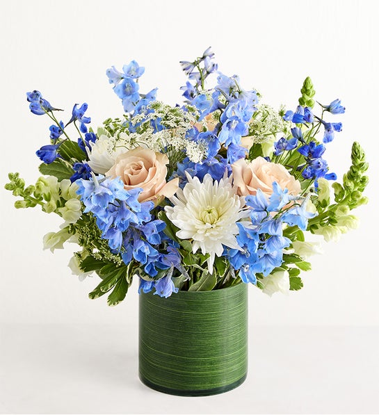 NEW The blue delphinium is our 2026 Flower of the Year, and it’s easy to see why: Its vivid color and petite petals enliven any arrangement. Here pale roses, snapdragons, and other blooms complement the sunny delphiniums beautifully, making this bouquet a surefire way to brighten someone’s day.